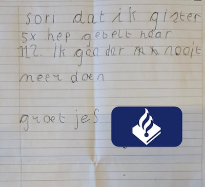 Een schuldbewust jongetje heeft politieagenten in Ridderkerk verrast met een handgeschreven brief. Het kindje belde vijf keer 112, terwijl er geen sprake was van een noodsituatie, en maakte later zijn excuses. ‘Ik ga dat nooit meer doen.’